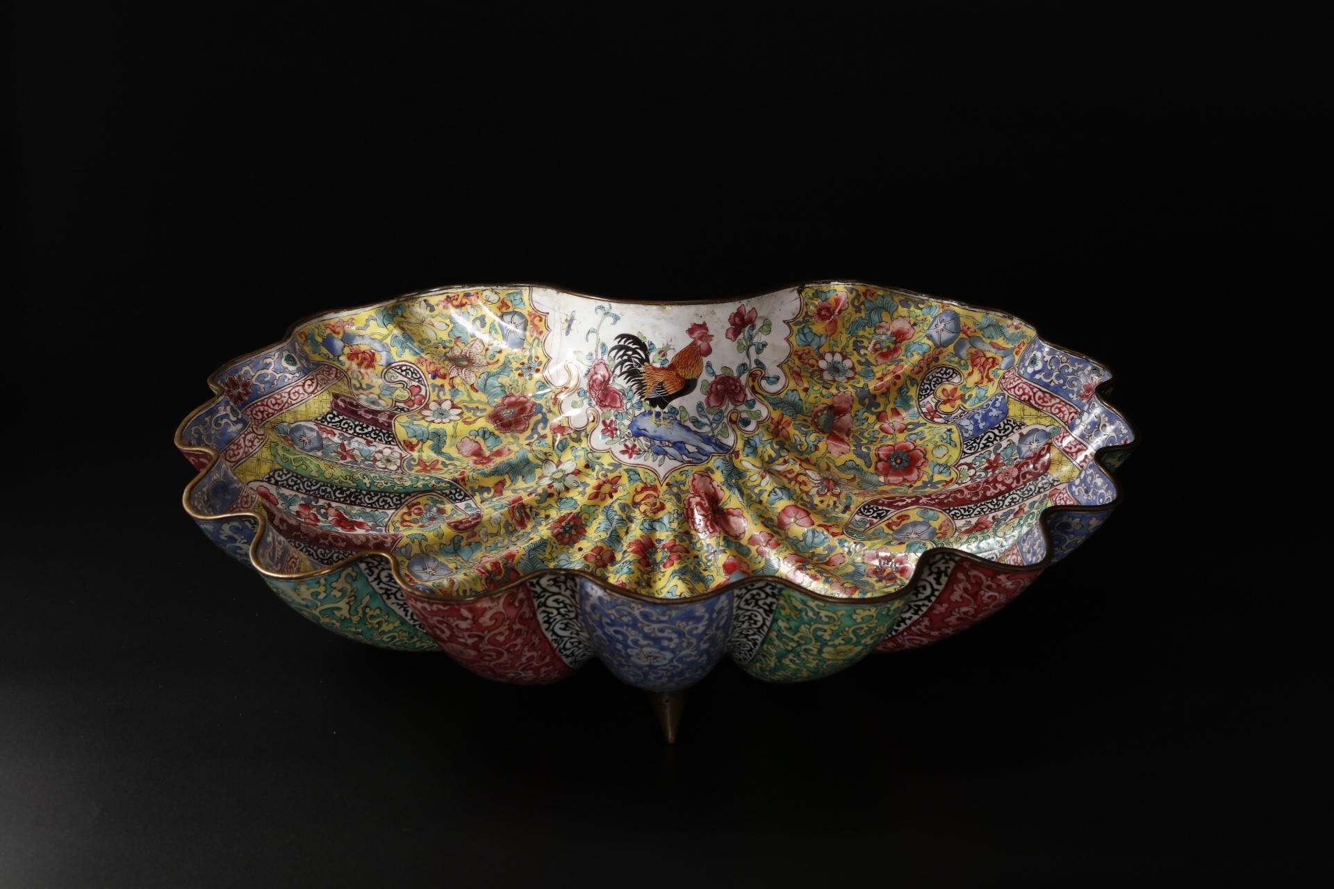 这件珐琅器先以铜丝在铜胎上捏出各种图案花纹,再填上珐琅釉料烧制而成。器身呈海棠形,两侧肩部各一条凸起的錾铜五爪龙耳。两面开光,内饰江崖海水、灵芝寿桃、双蝠等纹,开光外满饰“百花不露地”,寓意吉祥如意、欣欣向荣。