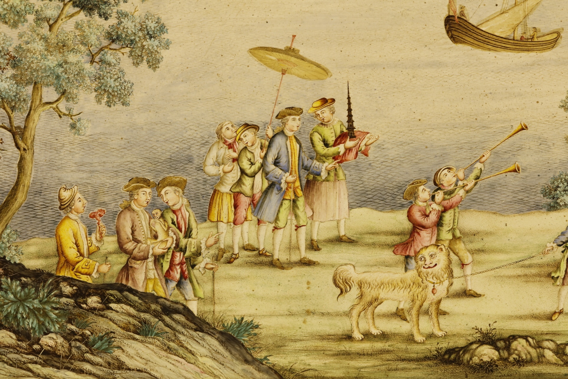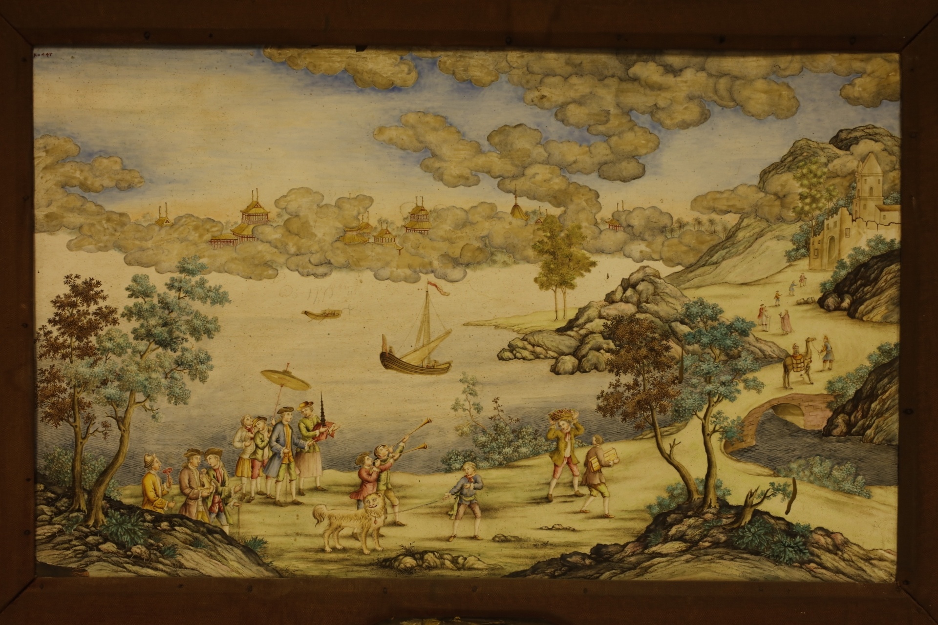 此藏品画心为铜胎画珐琅,画面中,人物山海、欧式古堡与中式亭台楼阁相映衬。这类中西绘画技巧相结合的画作,相当部分出自西方传教士(如郎世宁)及其学生之手,广东的珐琅工匠林朝楷入宫后也曾受教于郎世宁。