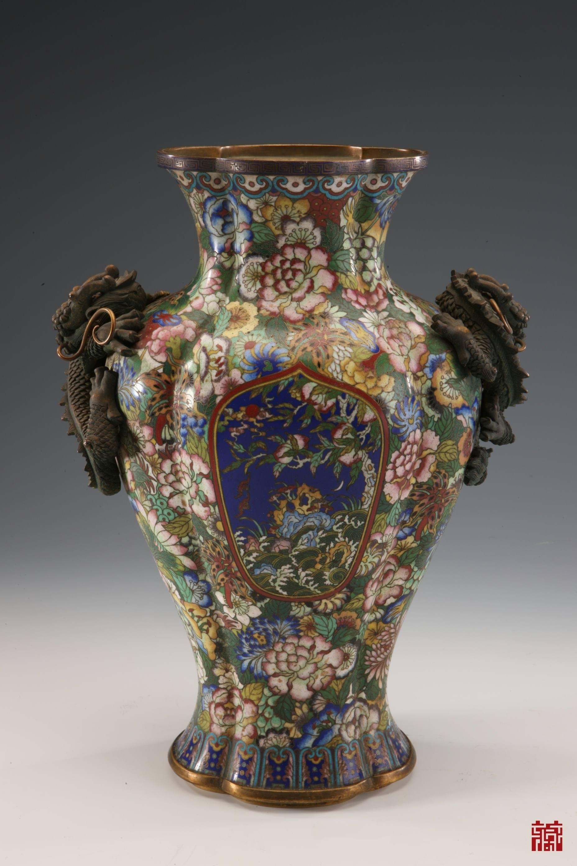 铜胎掐丝珐琅花地开光福寿图龙耳瓶 清代 广东省博物馆藏