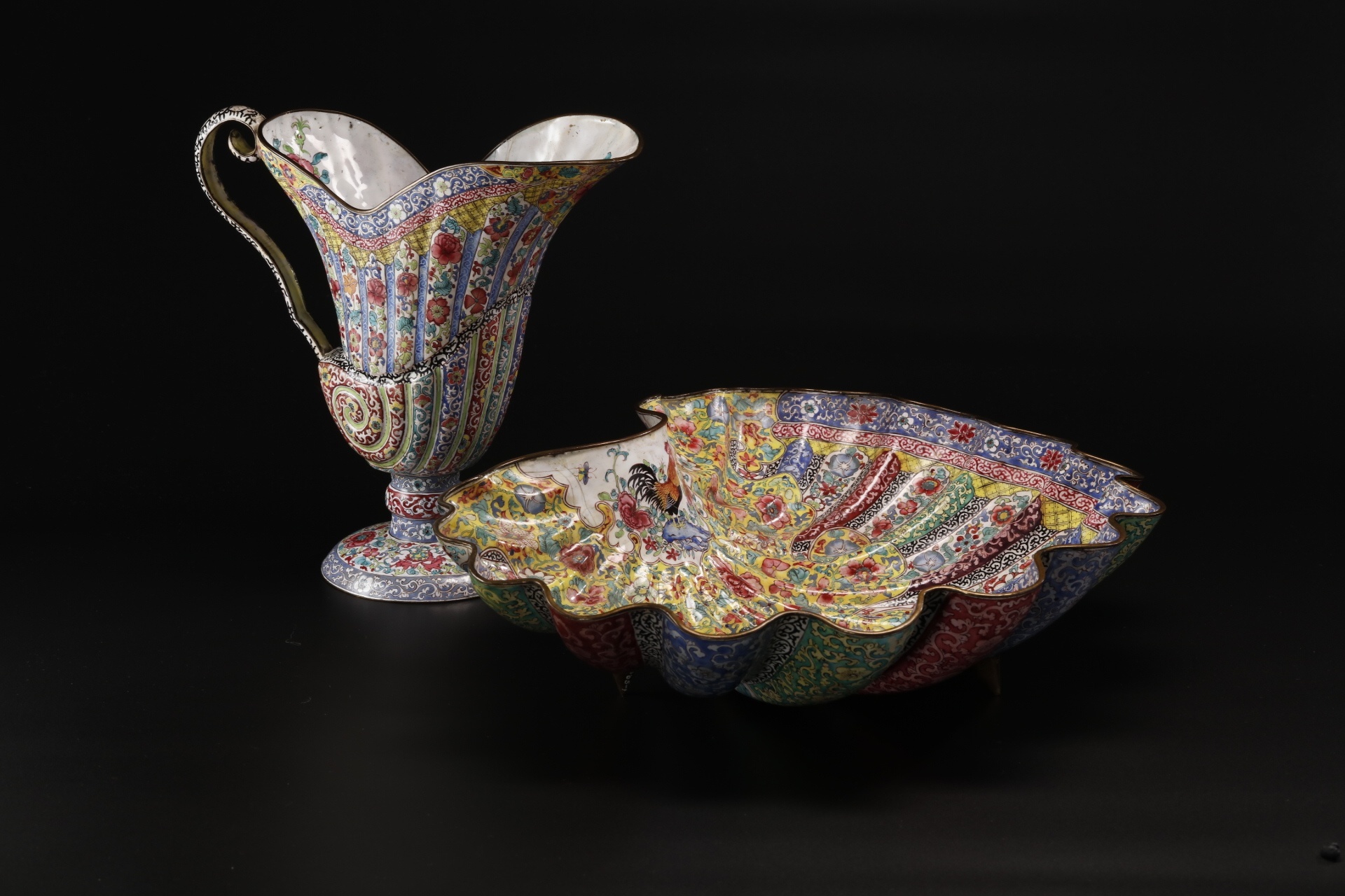 值得一提的是,广珐琅不仅以精绝工艺入贡清廷,更借海上丝路重返欧洲,实现华丽转身。此套器物为广州清代外销品,螺壳、贝壳形态的器物常见于外销瓷,属于欧洲18世纪最流行的洛可可风格。