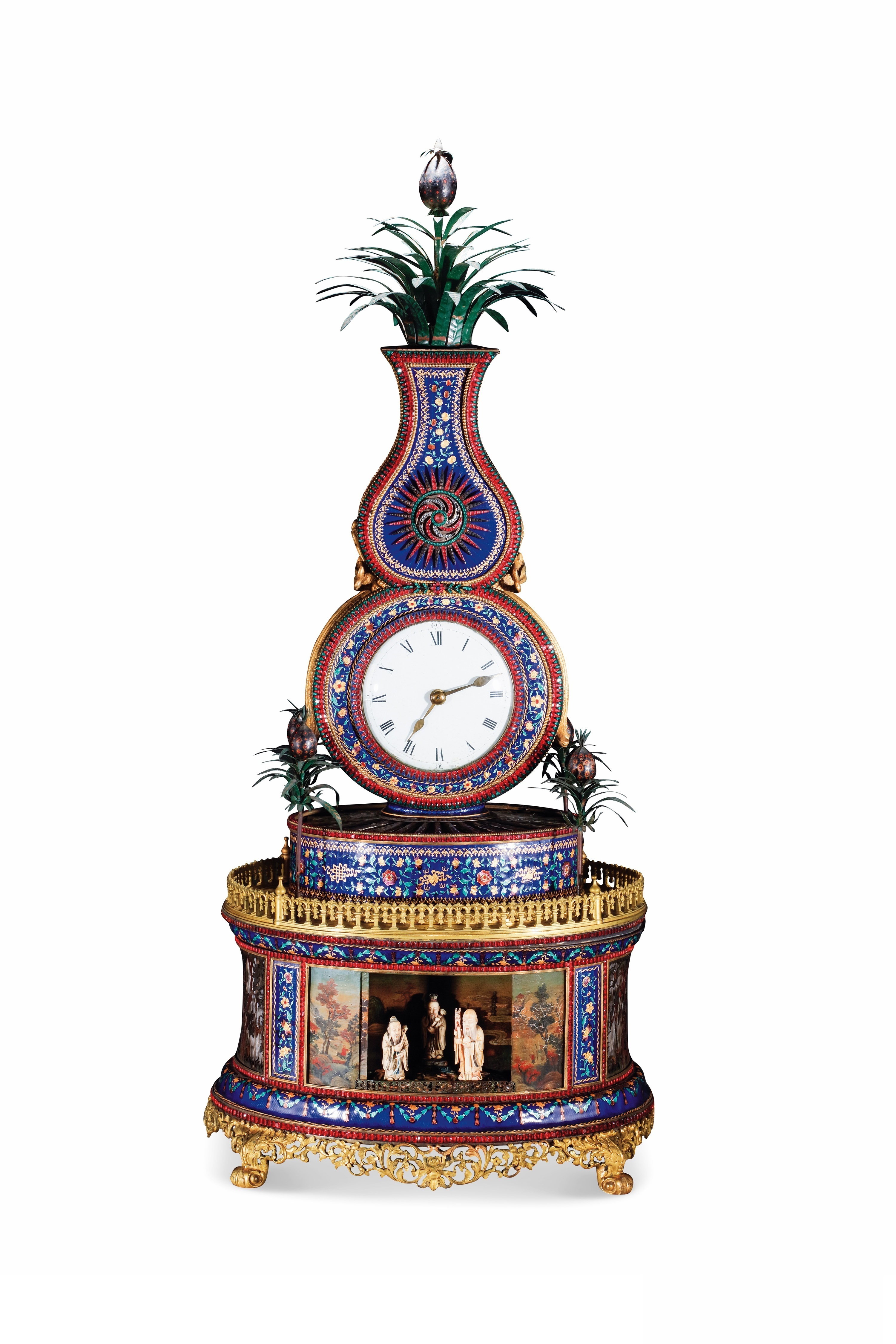 清代,透明珐琅仅在广州有制作,透明釉料被施于金属胎体之上,烧制后可透视胎底。这件机械座钟采用透明珐琅、画珐琅、錾刻、牙雕等多种工艺做装饰。上弦启动后,中门伴随音乐开启,福禄寿三星和转花、水法等同时转动,传递出“四海升平”的美好祝愿。