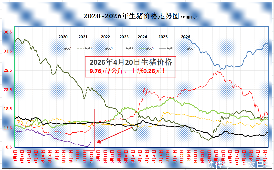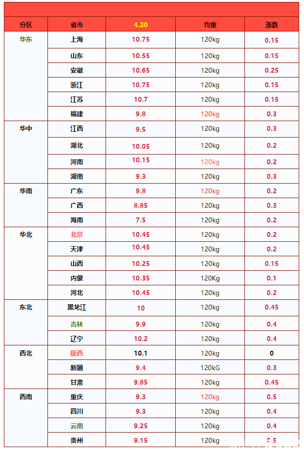 据数据分析,受屠宰场调价,预计,4月20日,外三元瘦肉型标猪价格出栏均价在9.76元/公斤,猪价上涨0.28元,后市关注生猪购销节奏的变化,尤其是,接下来养殖端出栏节奏的变化!